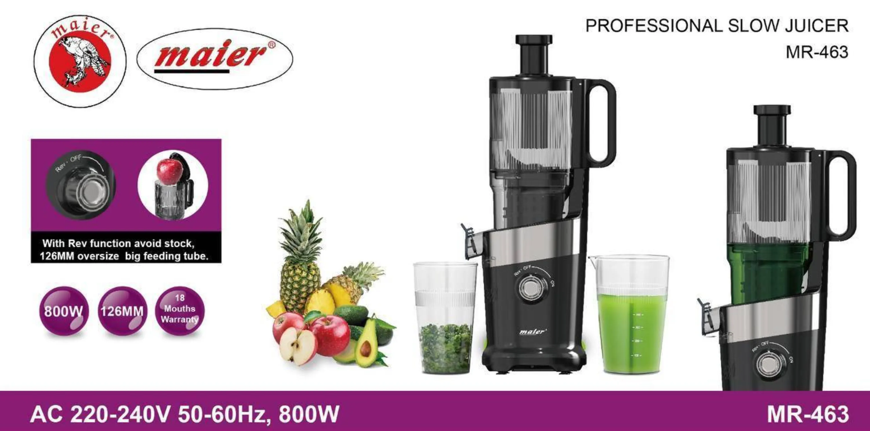 آبمیوه گیری مایر مدل MR-463، همراه همیشگی شما برای تجربه طعم تازه و طبیعی انواع میوهها! با قدرت بینظیر و طراحی شیک، آبگیری سریع و راحت را ممکن میسازد. لذت نوشیدنیهای سالم و انرژیبخش را با مایر تجربه کنید و به سلامت خود اهمیت دهید. خریدی که به زندگی شما طراوت میبخشد!