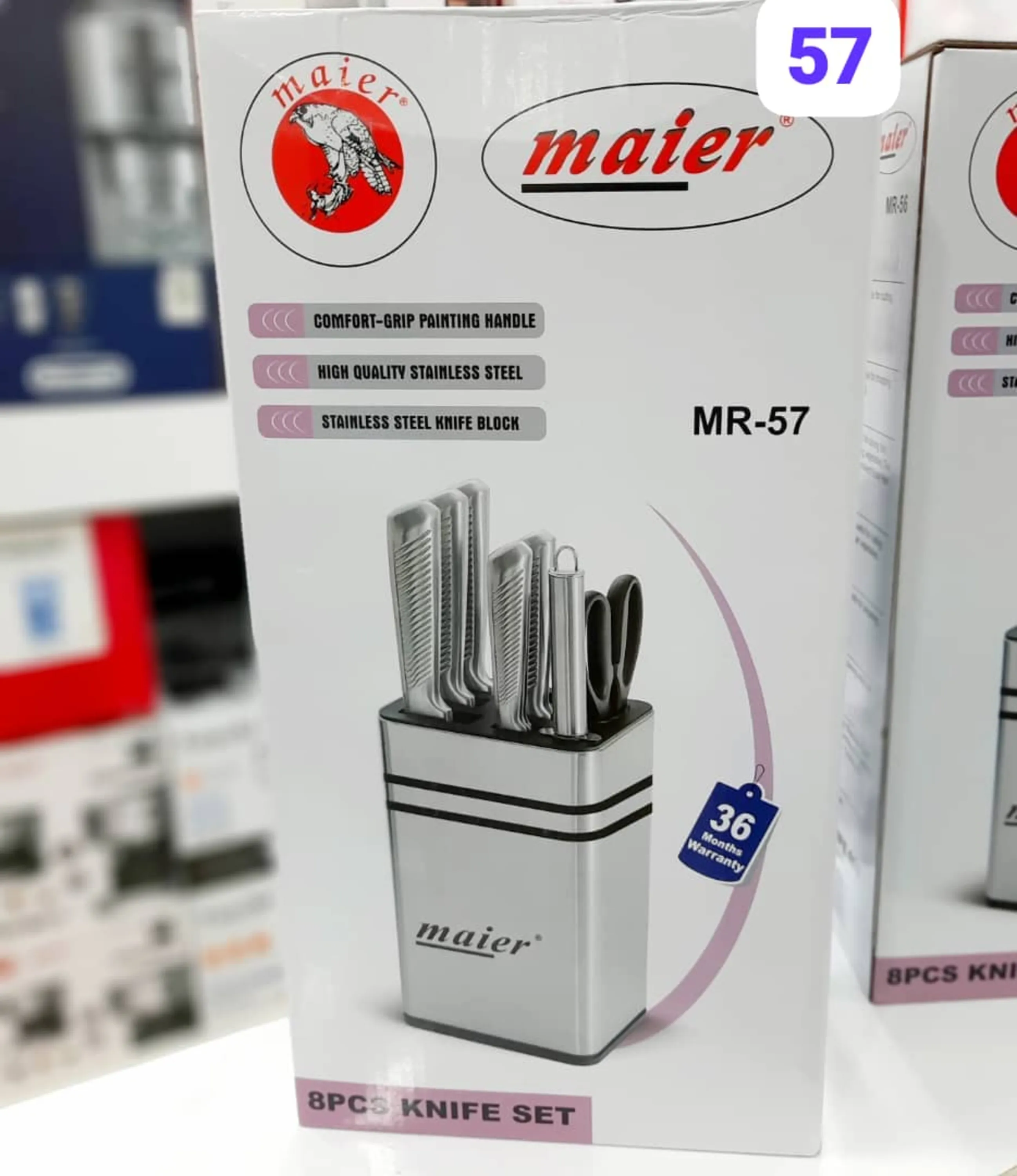 سرویس چاقو مایر مدل MR-57 یک مجموعه 8 پارچه با کیفیت بالا از برند معتبر مایر آلمان است. این سرویس شامل 4 عدد چاقو در اندازههای مختلف، یک عدد قیچی آشپزخانه، یک عدد چاقو تیزکن، و یک ساطور است که نیازهای برش انواع مواد غذایی مانند گوشت، نان، و سبزیجات را به طور کامل پوشش میدهد.