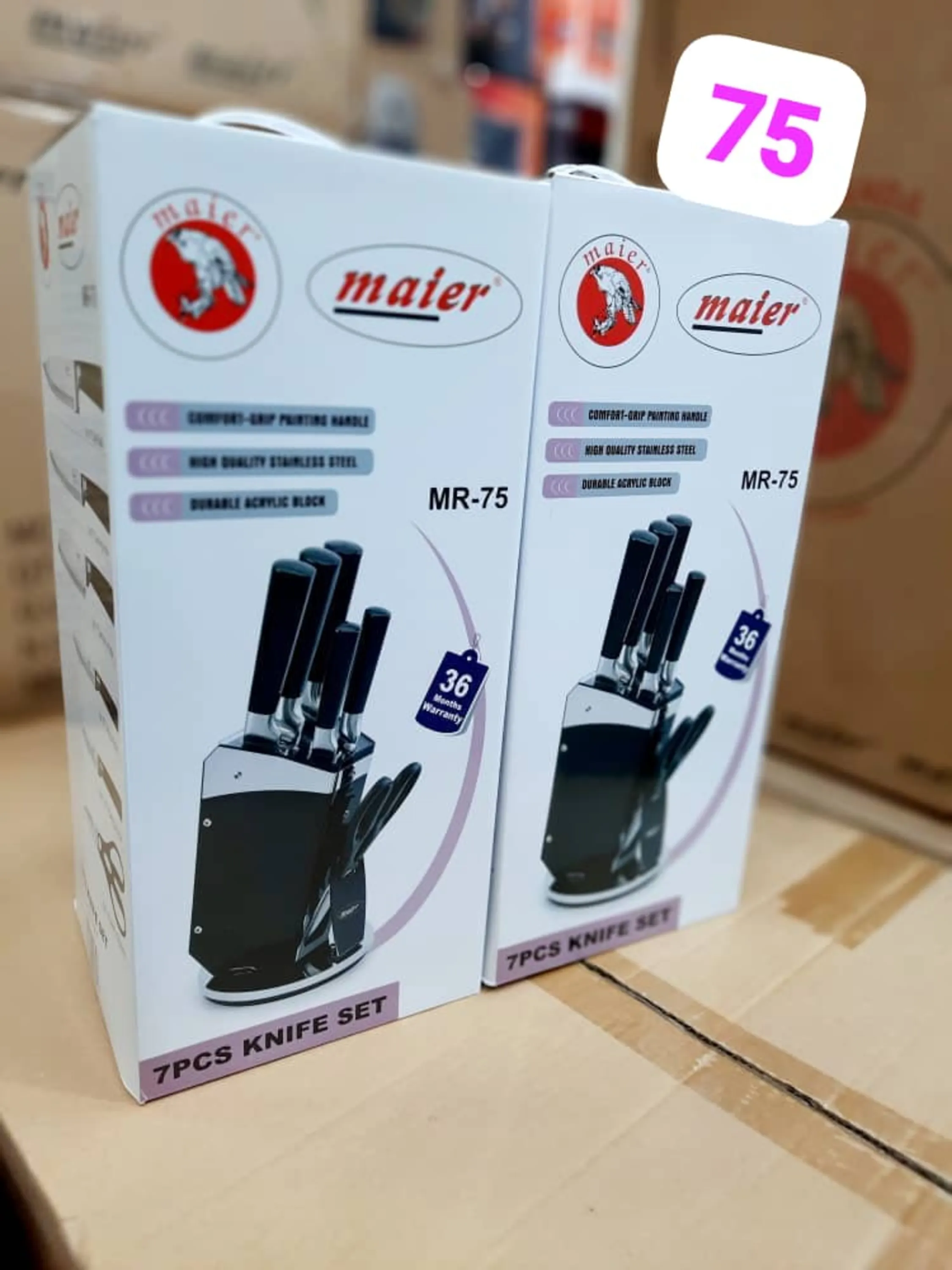 دارای 4 عدد چاقو در سایز های کوچک به بزرگ بوده که دارای قدرت بُرندگی بالایی میباشند و میتوانید هر نوع ماده غذایی را با آنها برش دهید. این سرویس همچنین دارای یک ساطور کوچک است که به کمک آن میتوانید به راحتی گوشت را در قطعات مختلف خرد کنید. یکی دیگر از پارچه های سرویس چاقو آشپزخانه مایر مدل MR-75 چاقو بوده که به وسیلهی آن میتوانید نان، سبزیجات، انواع گوشت و ... را سریعتر از چاقو برش دهید.