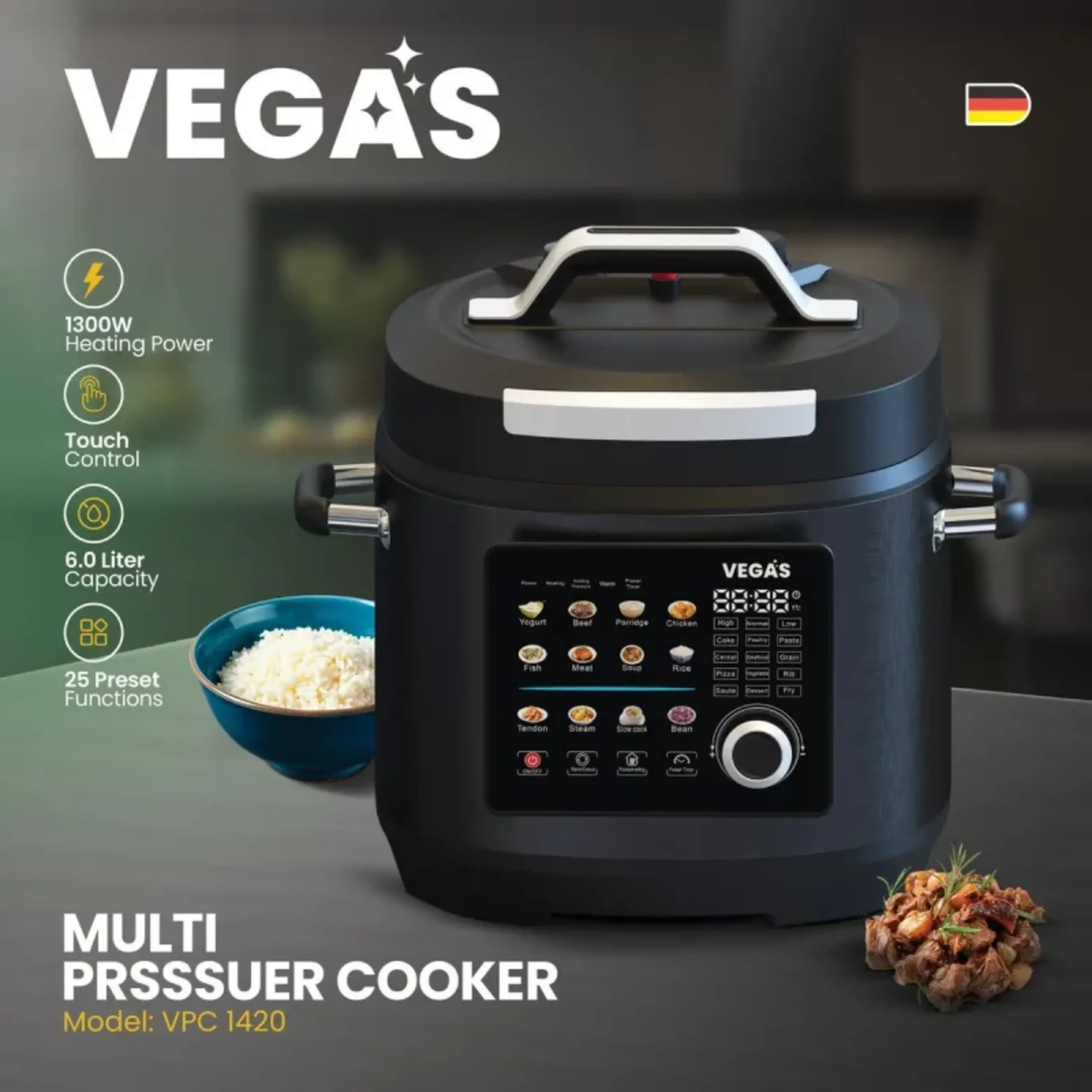 معرفیتوان مصرفی سیستم گرمایشی: 1300 واتظرفیت: 6 لیترصفحه نمایش: تمام رنگ با کنترل لمسیتعدا عملکرد های پخت: 25 عملکرد پخت و پز هوشمندجنس قابلمه: قابلمه داخل گرانیتی با کیفیت بسیار بالاعملکرد گرم نگهدارنده: داردقابلیت تنظیم دما و تایمر: دارد