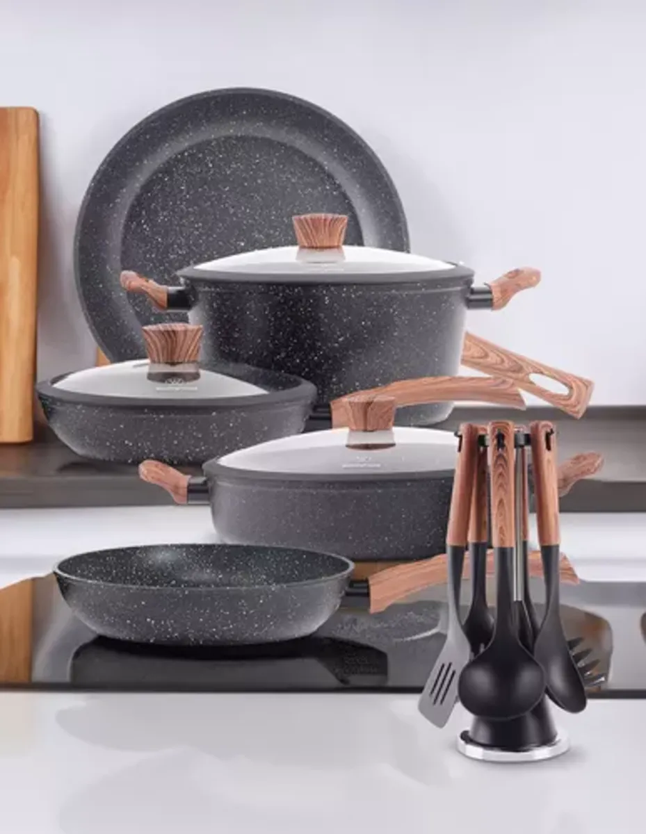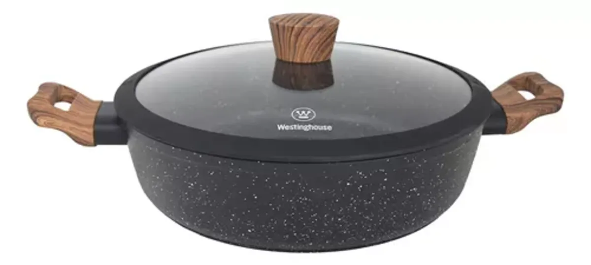 جنس بدنه: احتمالاً از آلومینیوم با روکش گرانیتی یا سرامیکی نچسب، که مقاومت بالا در برابر حرارت و خط و خش دارد.